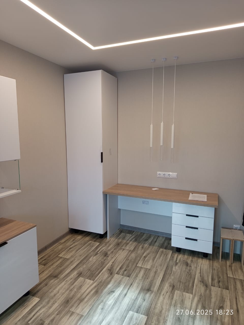 · Столешницы ТВ‑тумбы и письменного стола из ЛДСП Lamarty в оттенке «Каньон Песчаный» — природная текстура и тёплый песочный тон добавляют уюта, создавая приятный контраст с белоснежным корпусом.