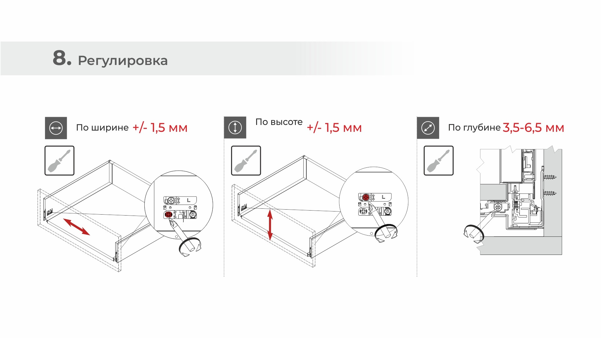 СТАРТ ПУШ+СОФТ допускает регулировку фасада по ширине и высоте на +/- 1,5 мм.