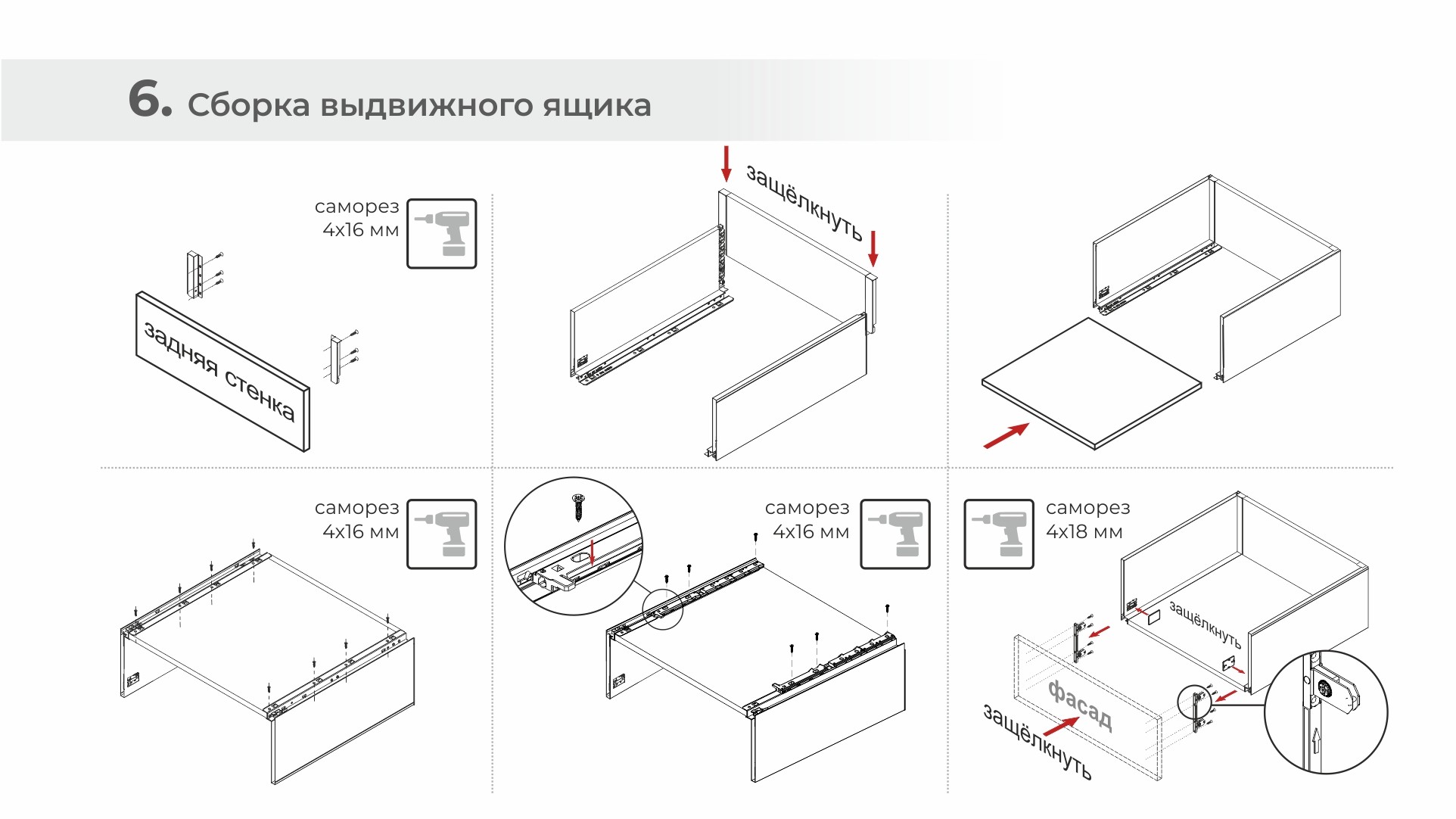Сборка выдвижного ящика СТАРТ ПУШ+СОФТ проводится по аналогии со сборкой других типов СТАРТ, за исключением одного момента: при креплении боковины ко дну выдвижного ящика необходимо дополнительно прикрепить рейку ответной части механизма ПУШ через пластину крепления боковой стенки. Для простоты процесса на рейке предусмотрены специальные выступы, которые входят в отверстия пластины боковой стенки.