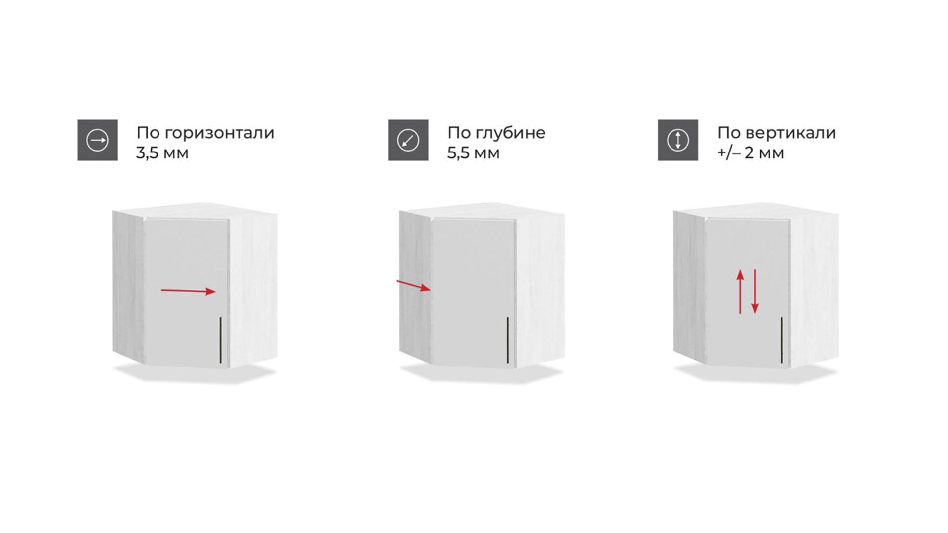 3D-регулировка: по горизонтали 3.5 мм, по глубине 5.5 мм, по вертикали +/-2 мм;