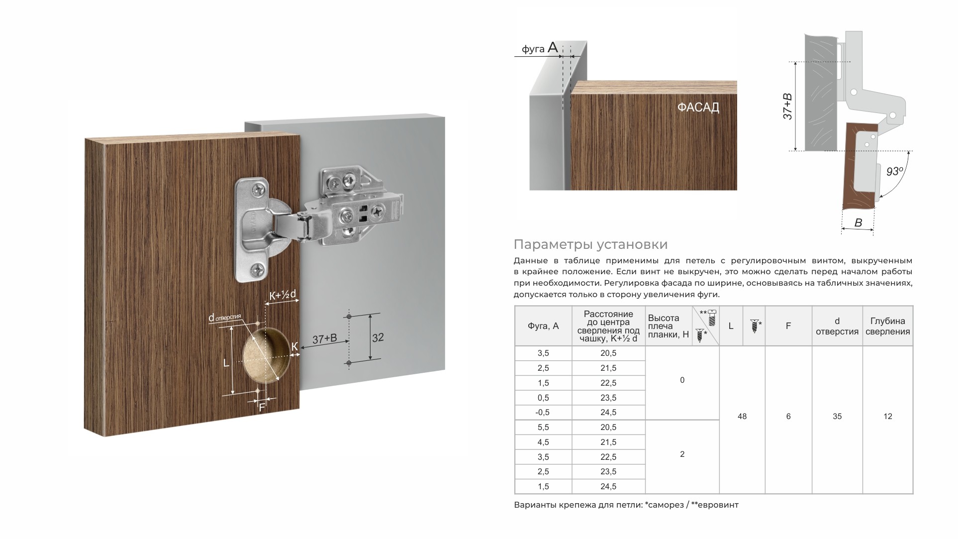 Для более прочного соединения с плитой при креплении петель и ответных планок саморезами рекомендуется использовать футорки F04/01/10*12W/0.