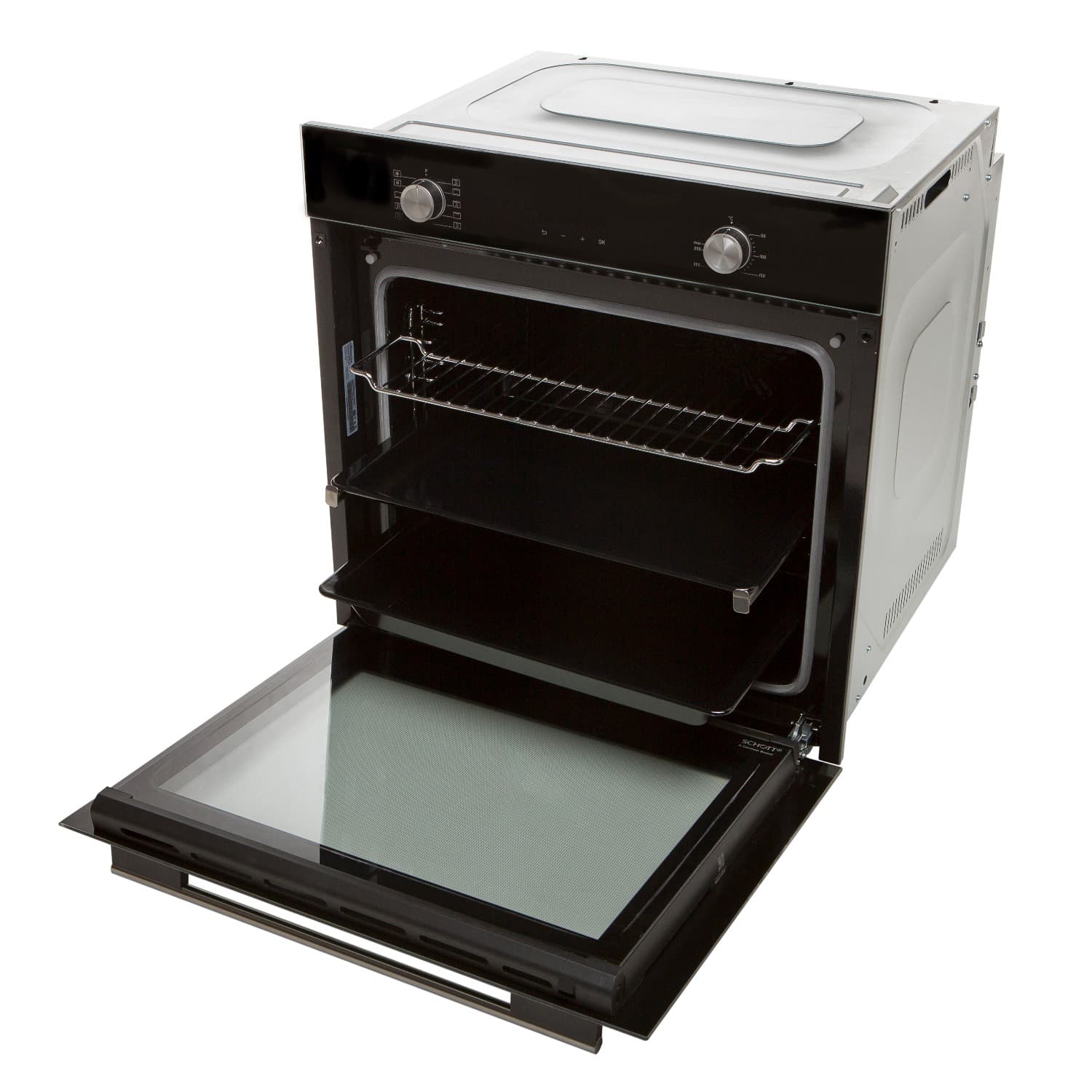 • Материал фасада: Узкая стеклянная панель управления + стеклянная дверца духовки из черного стекла от немецкого производителя Schott Ceran